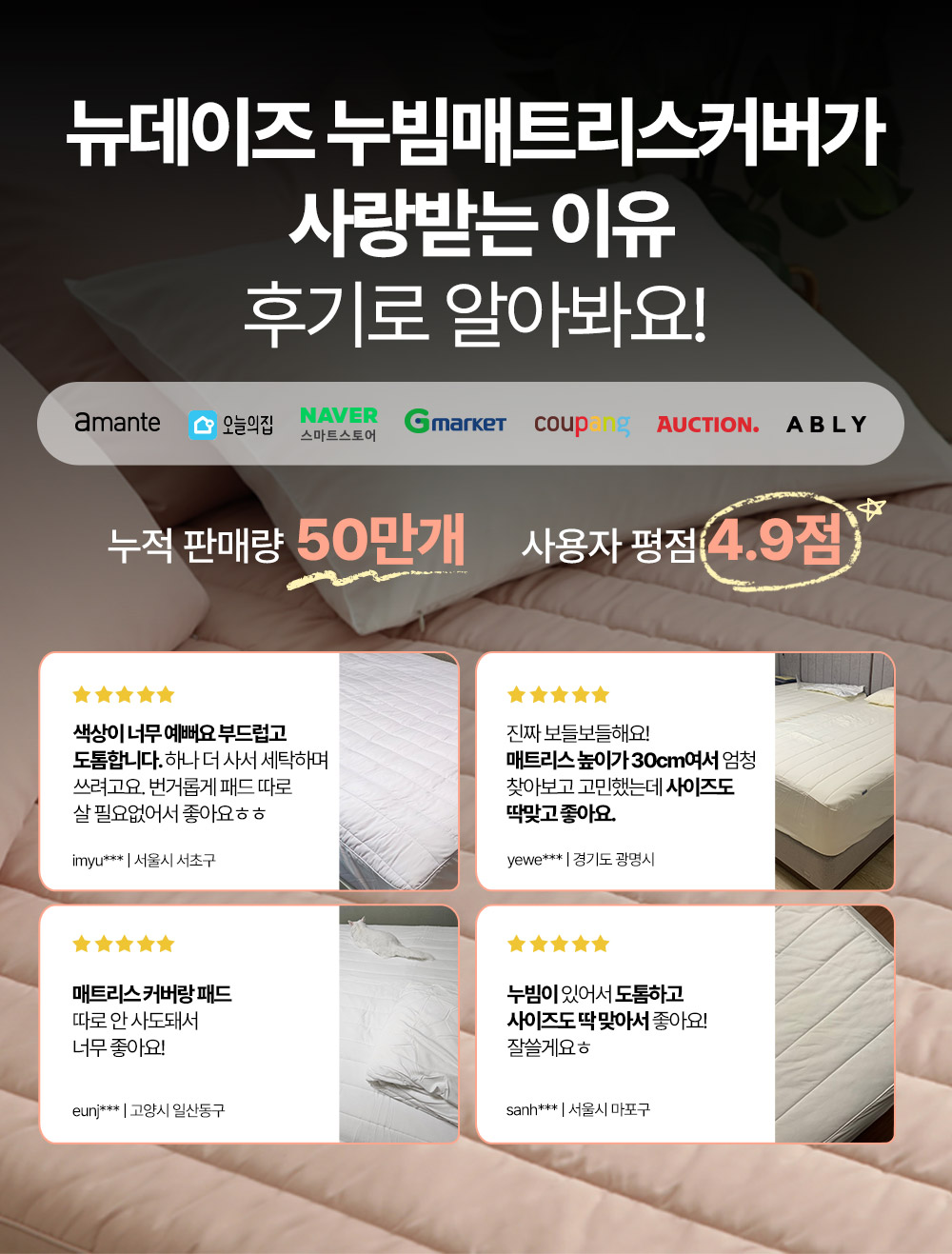 [특가 ~2/9]먼지없는 뉴데이즈 누빔매트리스커버 SS/Q/스몰K/K/LK 11컬러
