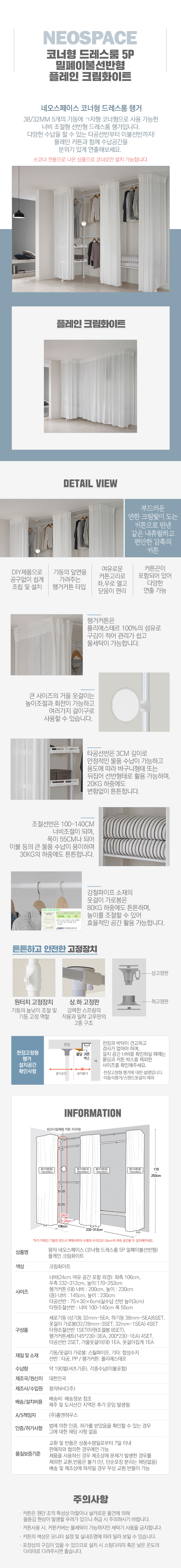 [왕자행거] 네오스페이스 (코너형 드레스룸 5P 밀폐이불선반형) 플레인 크림화이트