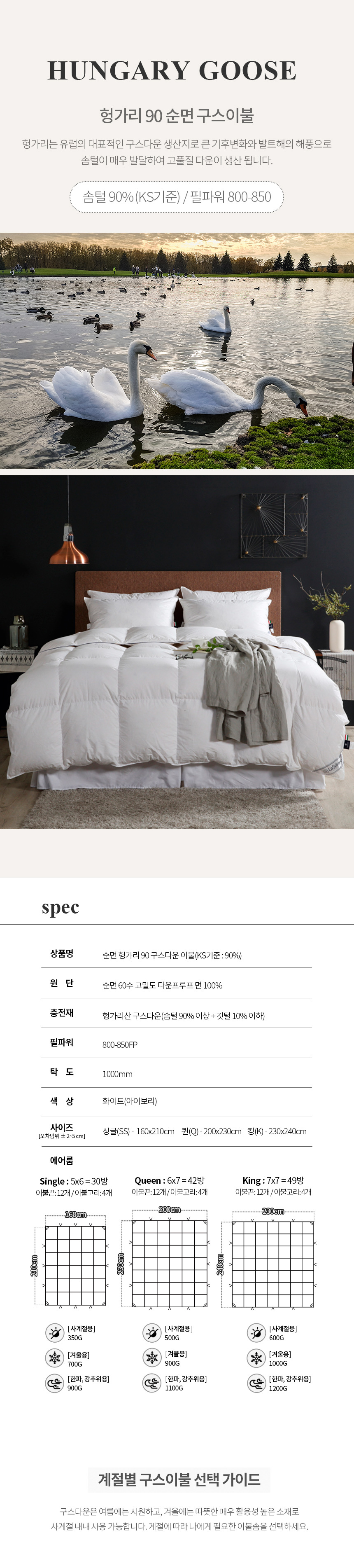 라셀렌 헝가리 다운90% 순면 구스이불 Q 900g 겨울용