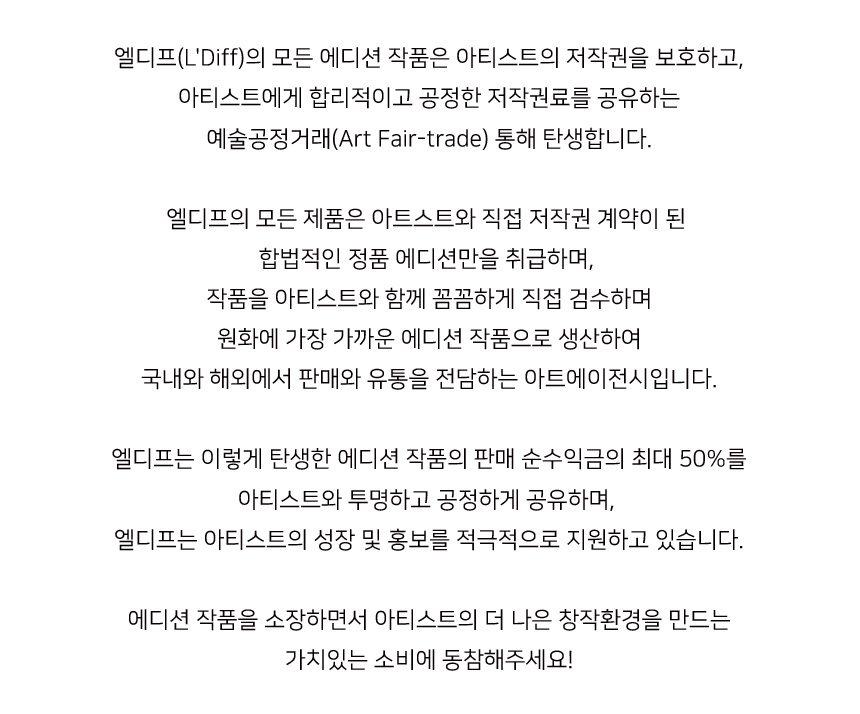 안소현 작가는 “오랜 고민 끝에 개인 소장작품들과 많은 분들에게 관심을 받았던 작품들을 세세히 선별하여 작가와 작품을 보호하며 예술공정거래 문화를 만드는 소셜벤처 엘디프와 이 에디션을 제작하게 되었다”고 전했다. 콜렉터즈 에디션으로 출시되는 작품들은 작품 당 100개 한정으로만 제작되며, 구매 순서에 따라 작가가 직접 기입한 에디션 넘버와 친필사인이 있는 에디션 카드를 동봉한다. 엘디프의 나현수 공동대표는 “특히 이번 리미티드 에디션은 유럽에서 아트 에디션에 사용되는 파인아트용 캔버스 출력을 사용하여 원화와 가장 가까운 수준으로 제작되었다”고 말했다. 안소현 작가의 엘디프 에디션 출시와 함께 오는 다음 달 6일에서 11일, 안국동 사이아트 갤러리에서는 안소현 작가의 개인전도 열린다. 청명한 가을 안국동의 고즈넉한 정취와 함께 안소현 작가의 신작을 감상하며 안온한 휴식을 즐길 수 있을 것이다. 생각보다 빨리 다가오는 듯 한 이번 겨울, 언제나 따뜻하고 편안한 햇빛을 바라보아온 안소현 작가의 에디션으로 당신의 공간은 물론 온기가 필요한 마음 한 켠을 채우는 따뜻하고 가치있는 나만의 소확행을 찾는 것은 어떨까. 에디션과 작가에 대한 자세한 내용은 엘디프 홈페이지에서 확인할 수 있다.