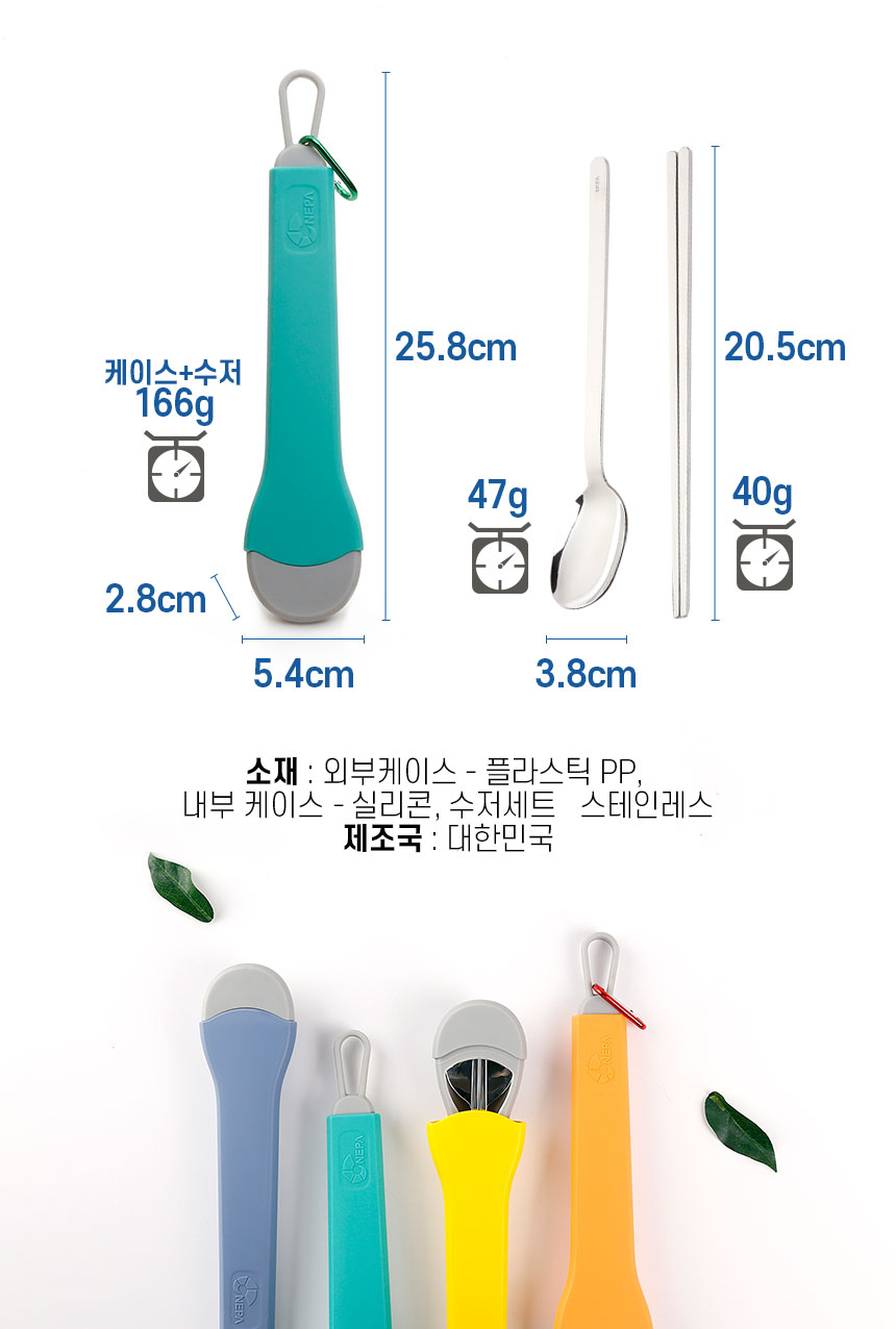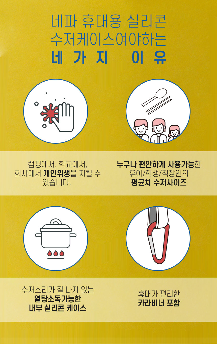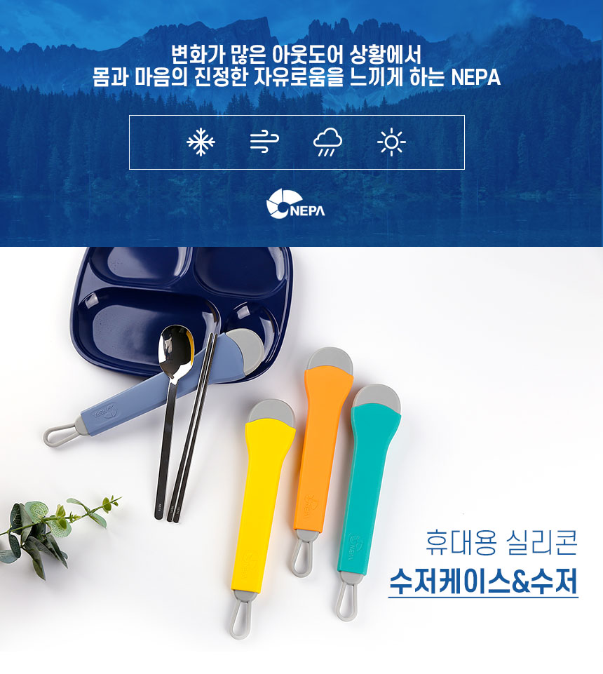 위생적으로 휴대하기 좋은 네파 수저케이스 세트입니다 믿고쓰는 국내생산 수저세트를 실리콘 케이스로 제작하여 흔들림 없고 소리 나지 않는 숟가락 젓가락 세트 입니다 수저(숟가락+젓가락) + 실리콘케이스 + 카리비너 포함 세트구성 입니다 자세한 내용은 아래 상세페이지를 확인하시구 구매해주세요:)