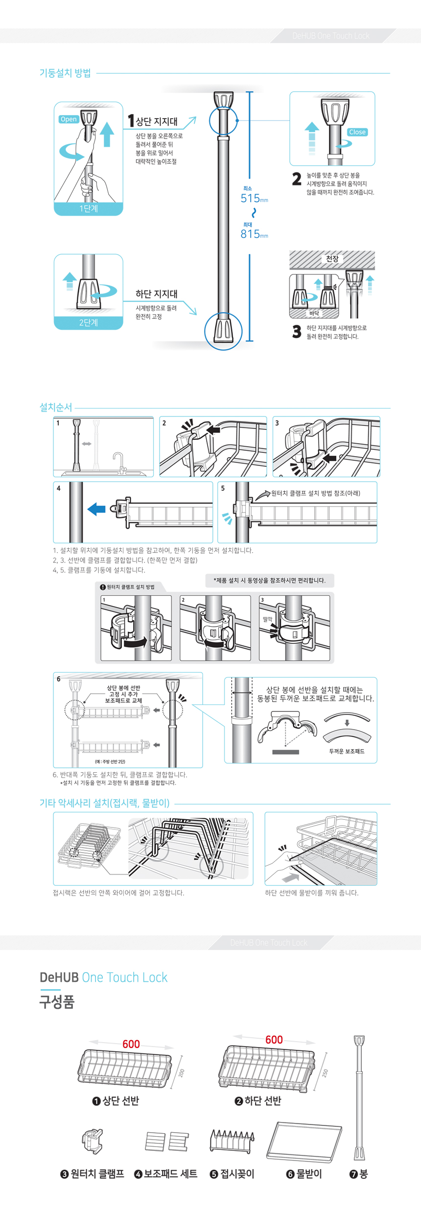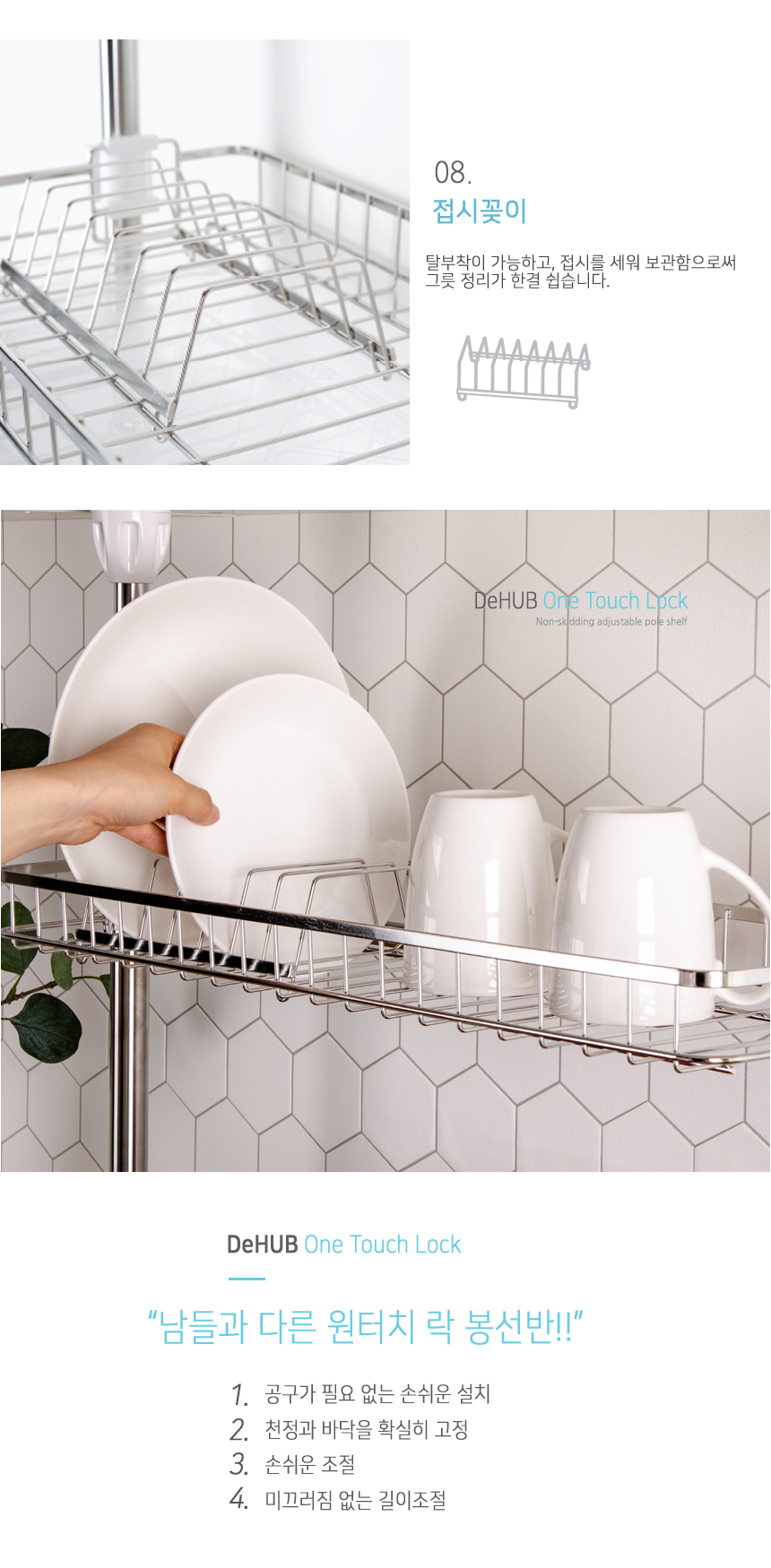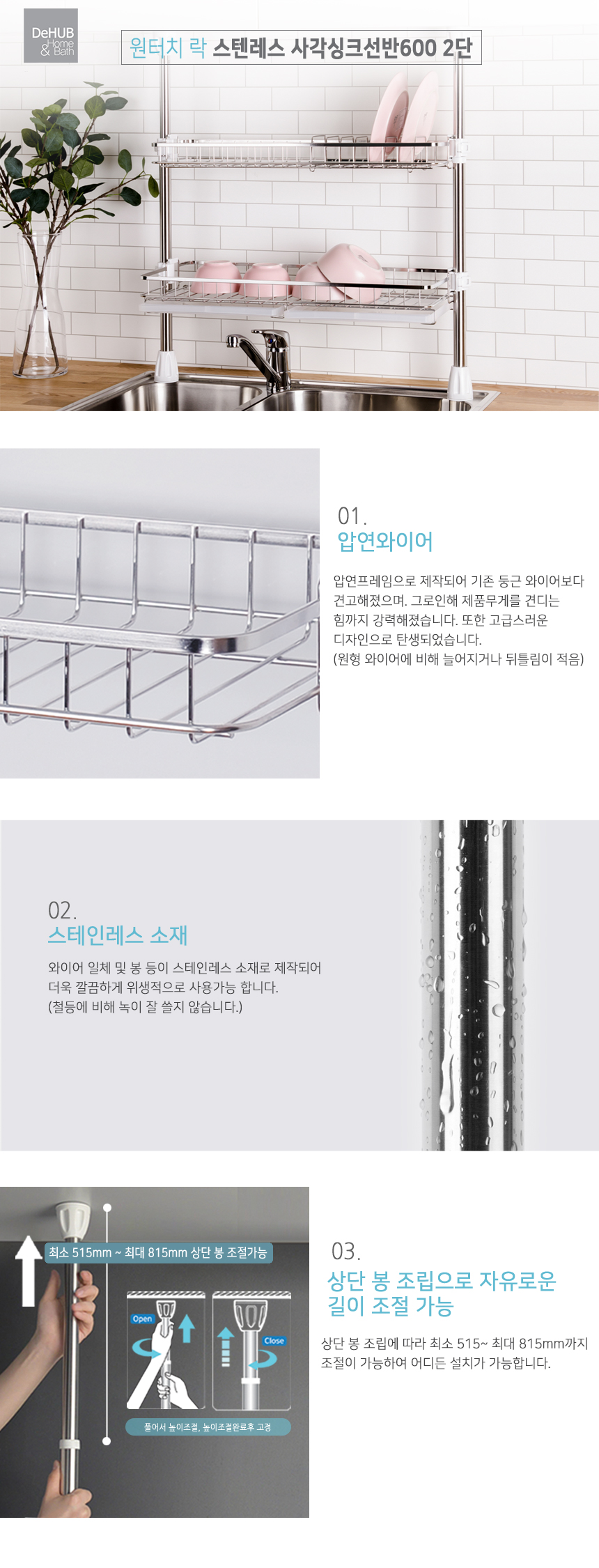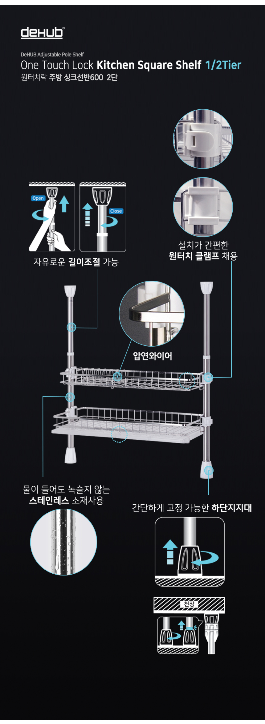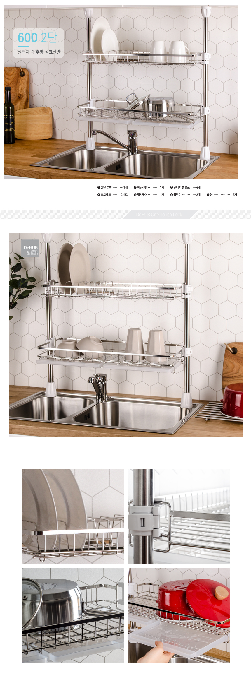 디허브 원터치 락 기둥식 스텐 사각 싱크선반 600 2단