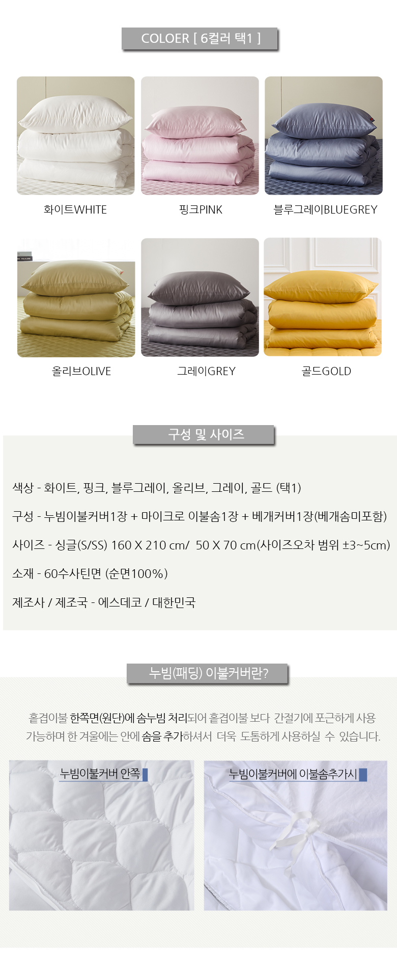 60수사틴 순면 누빔이불베개커버 솜세트S싱글 화이트