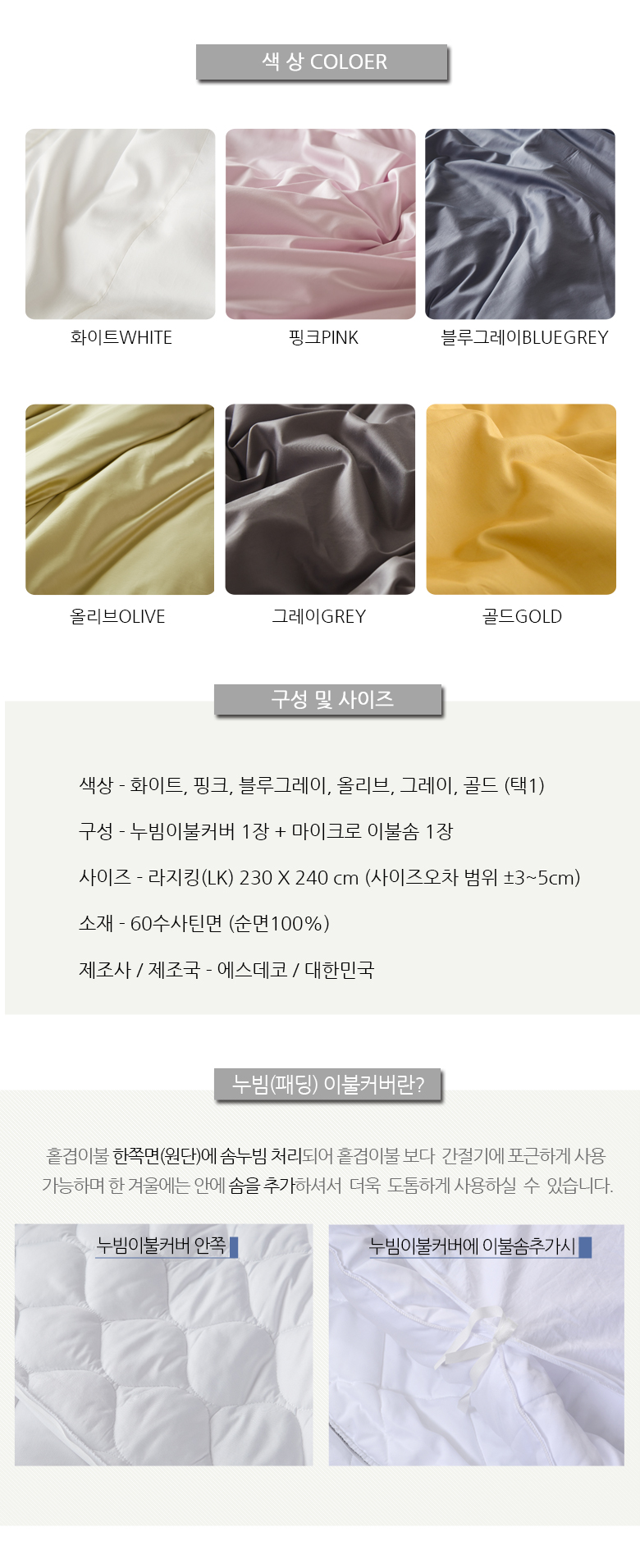 60수사틴 순면누빔이불커버이불솜포함LK라지킹 화이트