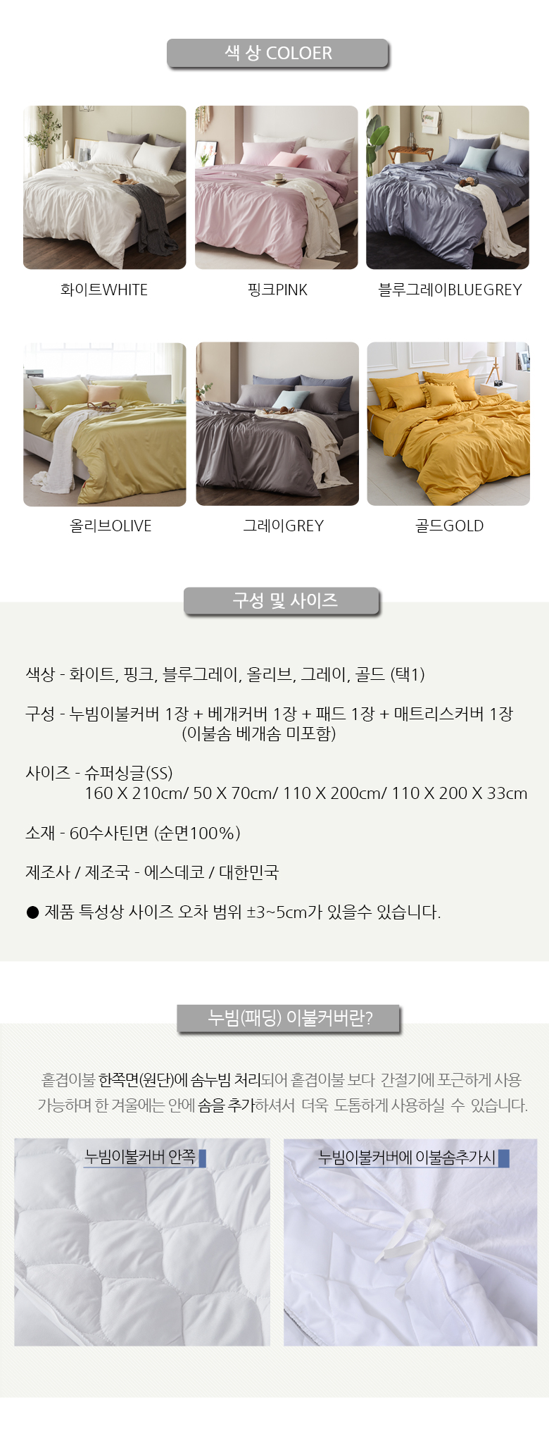 60수사틴 순면 누빔이불침대커버풀세트 SS싱글 화이트