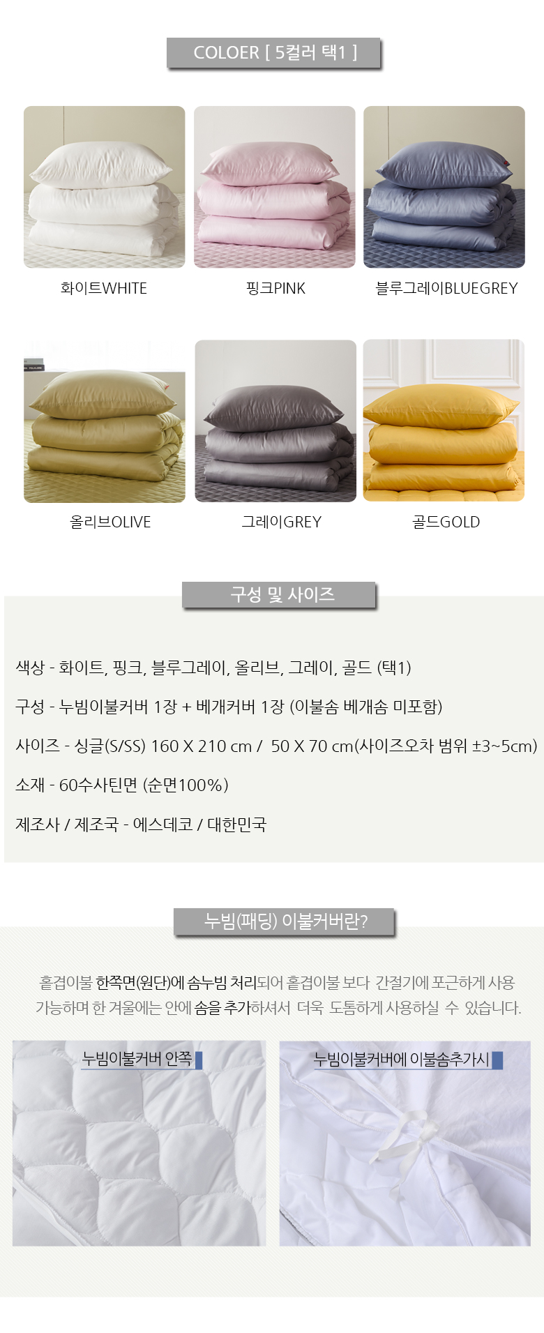 60수사틴 순면 누빔이불베개커버세트 S싱글 화이트