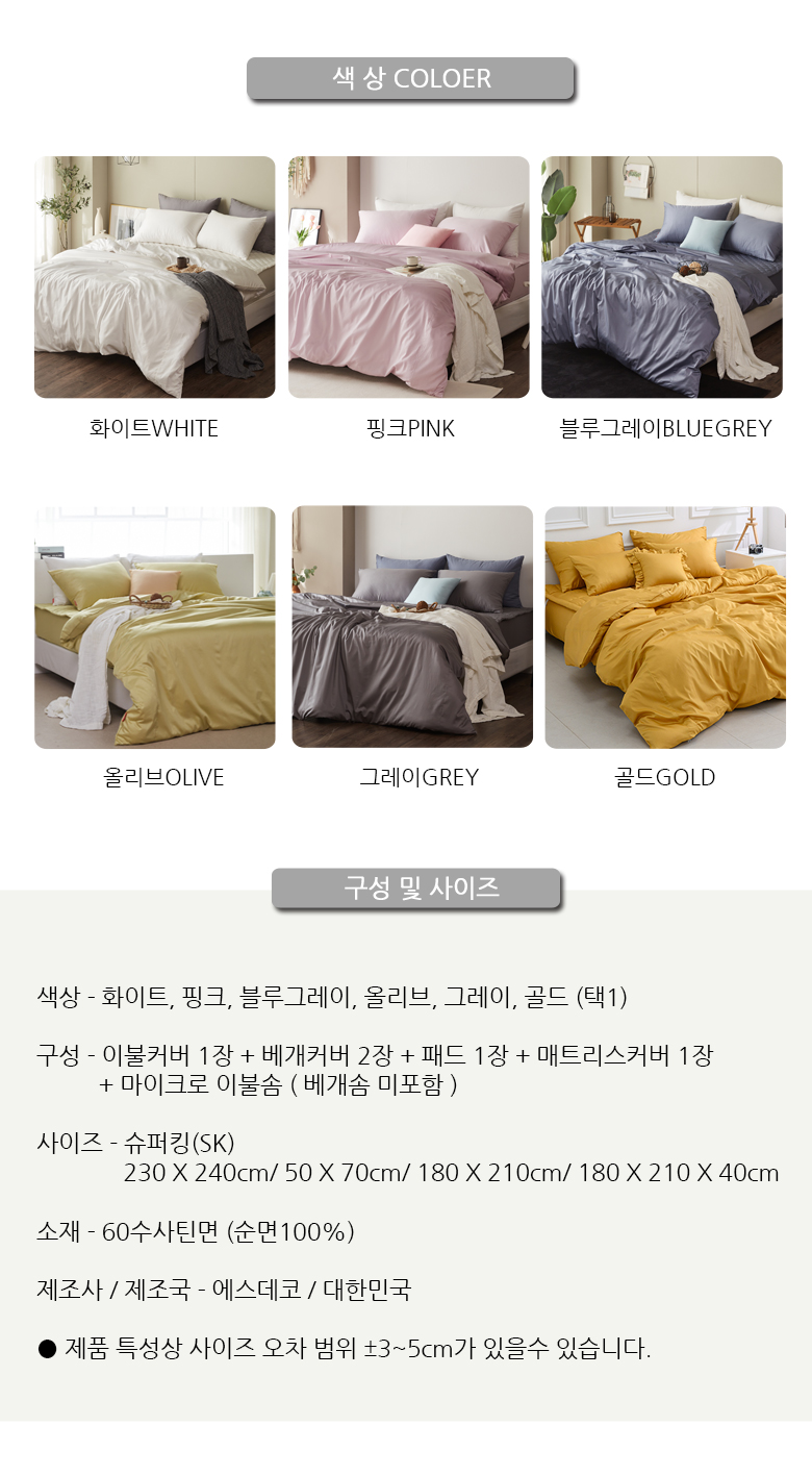 60수사틴 순면이불 침구풀세트 이불솜SK슈퍼킹 핑크