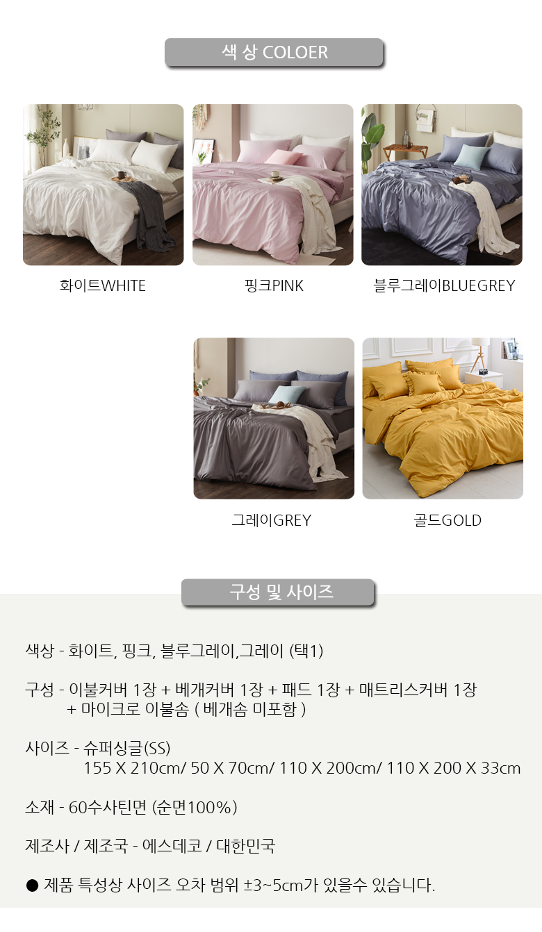 60수사틴 순면이불 침구풀세트 이불솜 SS싱글 블루