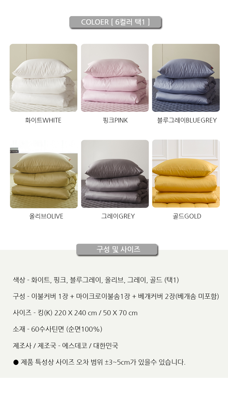 60수사틴 순면 이불커버베개세트 이불솜 K킹 5컬러