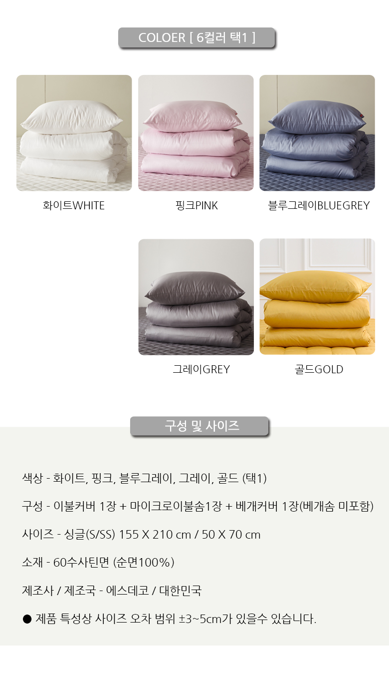60수사틴 순면 이불커버베개세트 이불솜 S싱글 5컬러