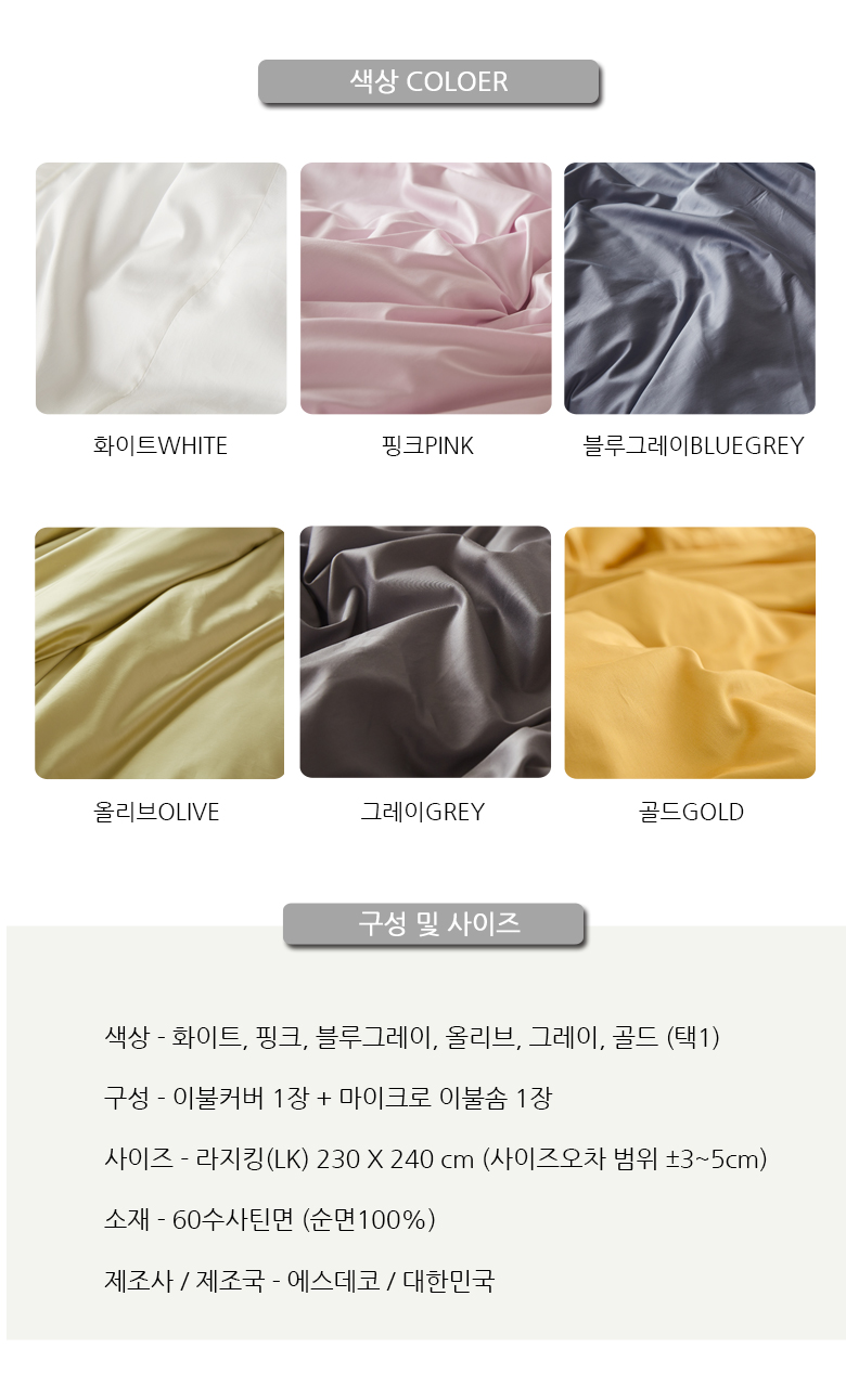 60수사틴 순면이불커버이불솜 호텔침구LK라지킹화이트
