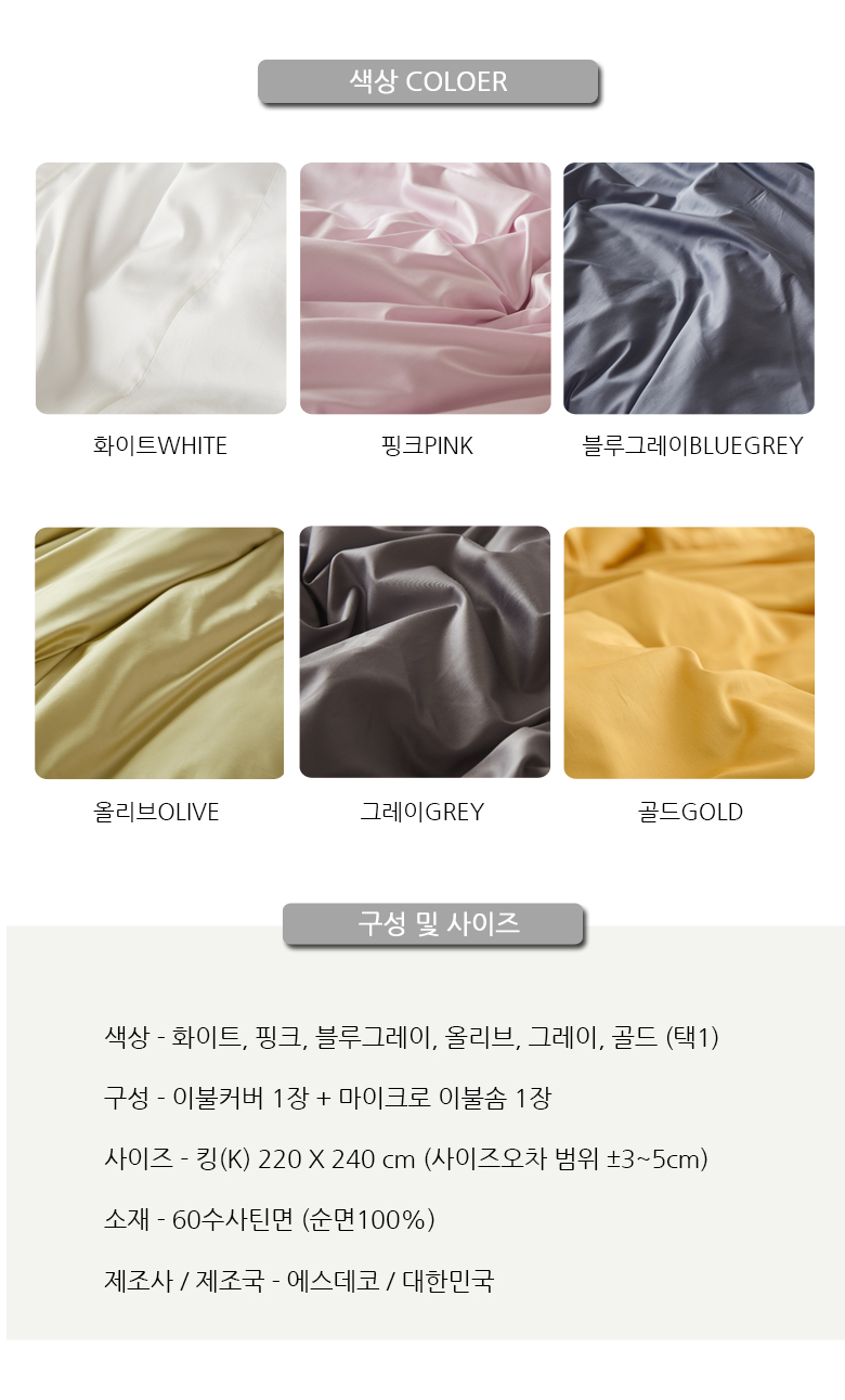60수사틴 순면이불커버 이불솜 호텔침구K킹 화이트