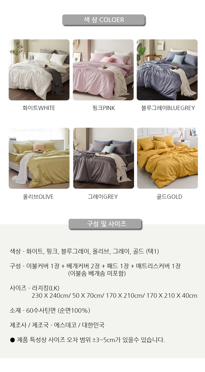 60수사틴 순면 호텔식 이불커버풀세트LK라지킹 5컬러