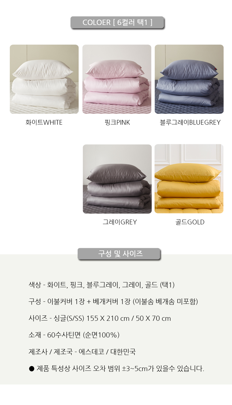 60수사틴 순면 이불커버베개세트 호텔침구S싱글 5컬러