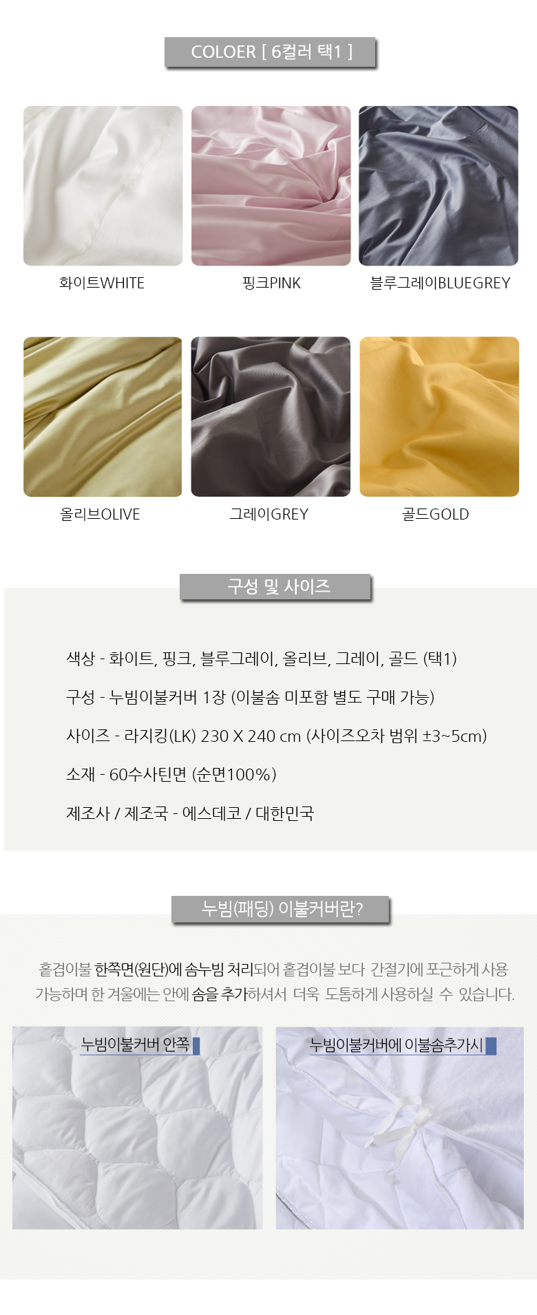 60수사틴 순면 누빔이불커버 호텔침구LK라지킹 5컬러