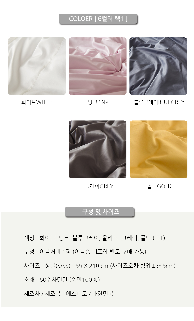 60수사틴 순면 이불커버 명품호텔침구S싱글 핑크