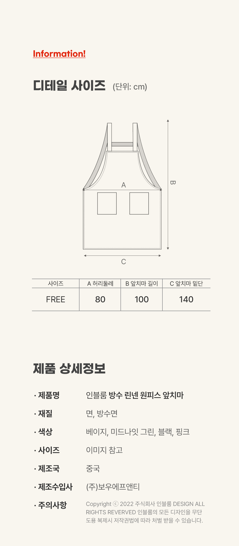 인블룸 1+1 방수 린넨 원피스 앞치마
