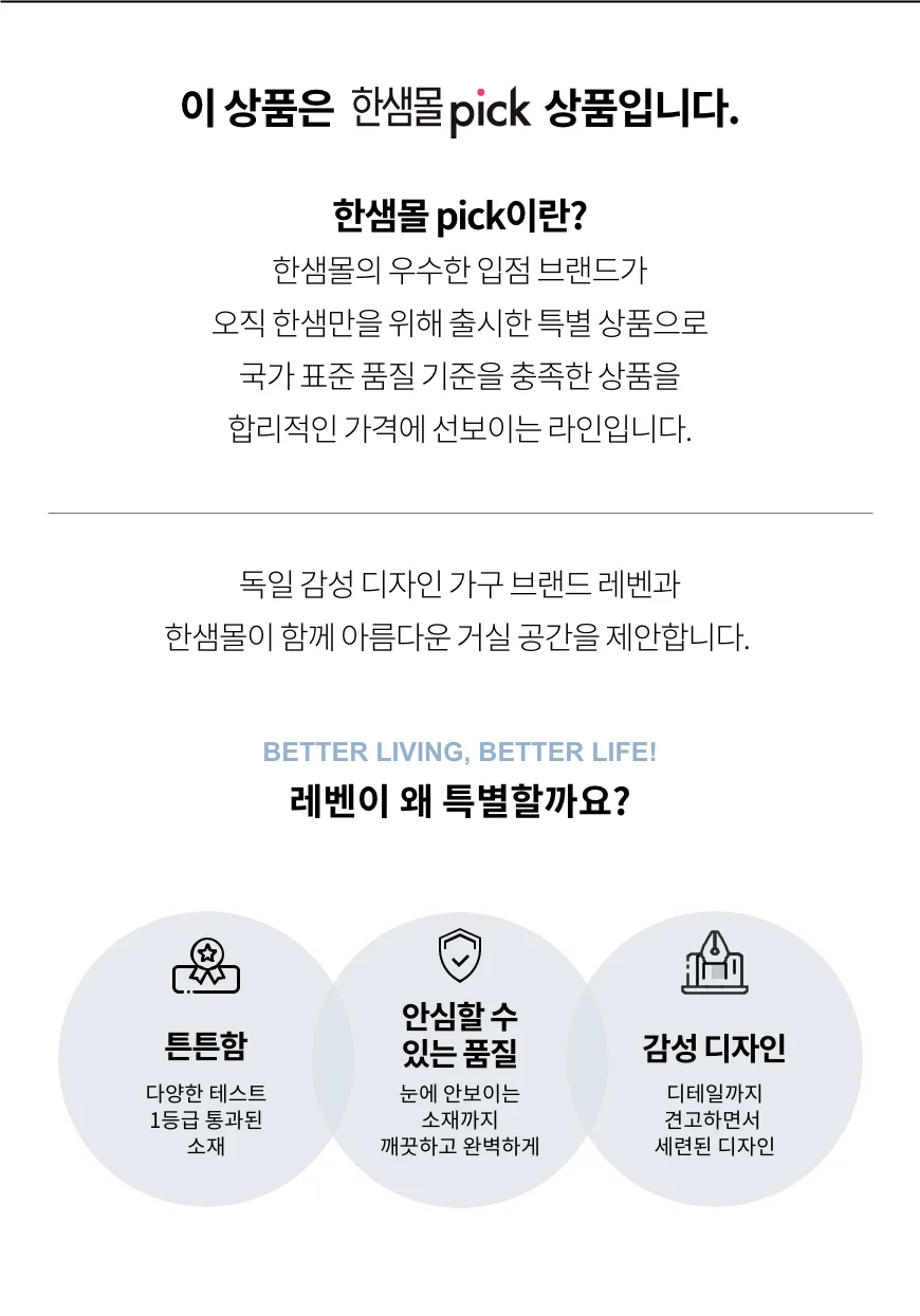 한샘몰 판매 상품 중 '입점브랜드상품'으로 명기된 상품의 경우, (주)한샘은 판매자가 아닌 통신판매중개자이므로 판매자로서의 책임을 부담하지 아니합니다. 해당 상품, 거래정보 및 거래에 대하여는 실제 판매자인 각 입점업체에게 책임이 있습니다.