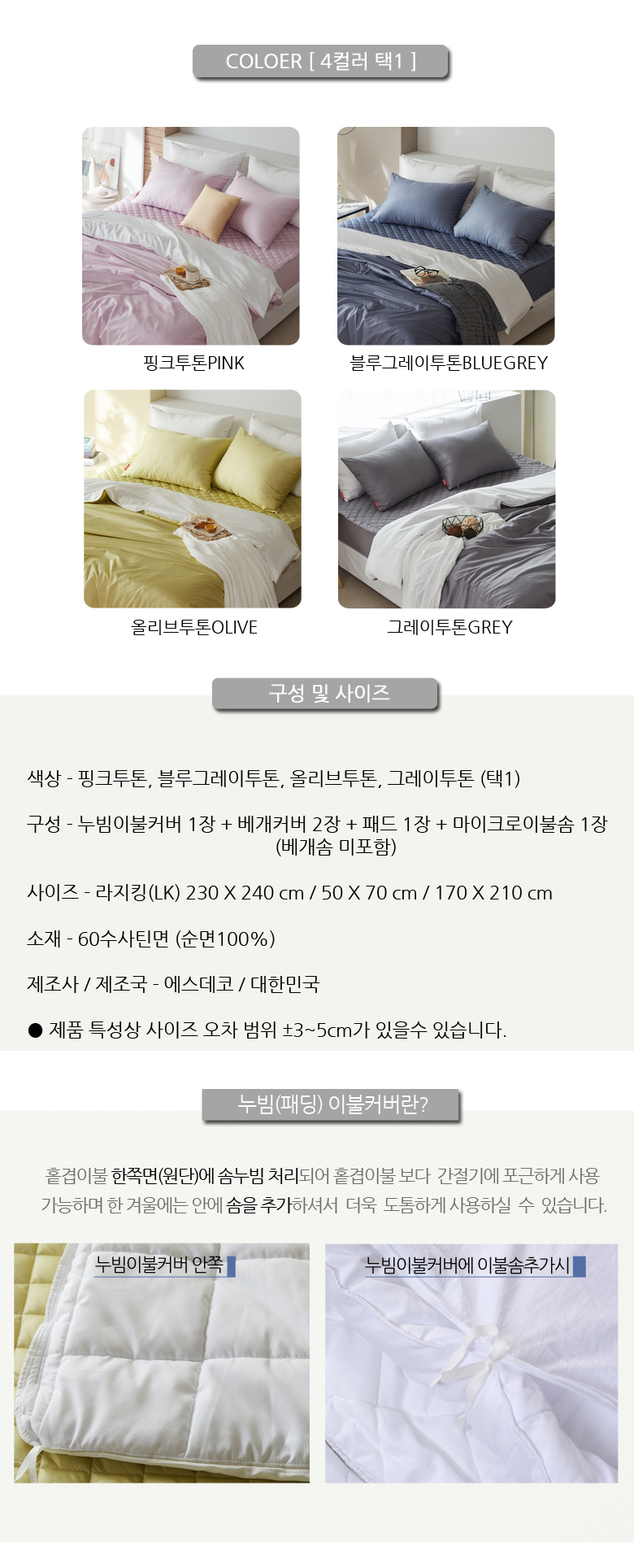 60수사틴순면 투톤누빔이불커버패드이불솜세트LK4컬러