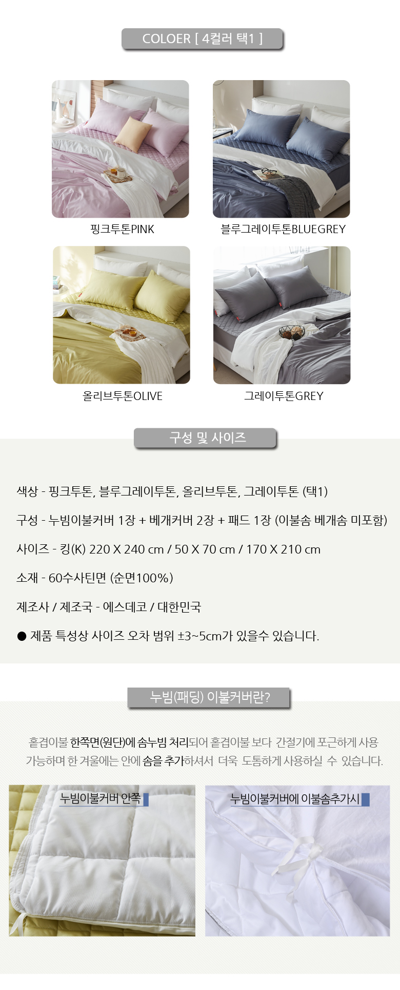 60수사틴 순면 핑크투톤누빔이불커버패드세트K킹