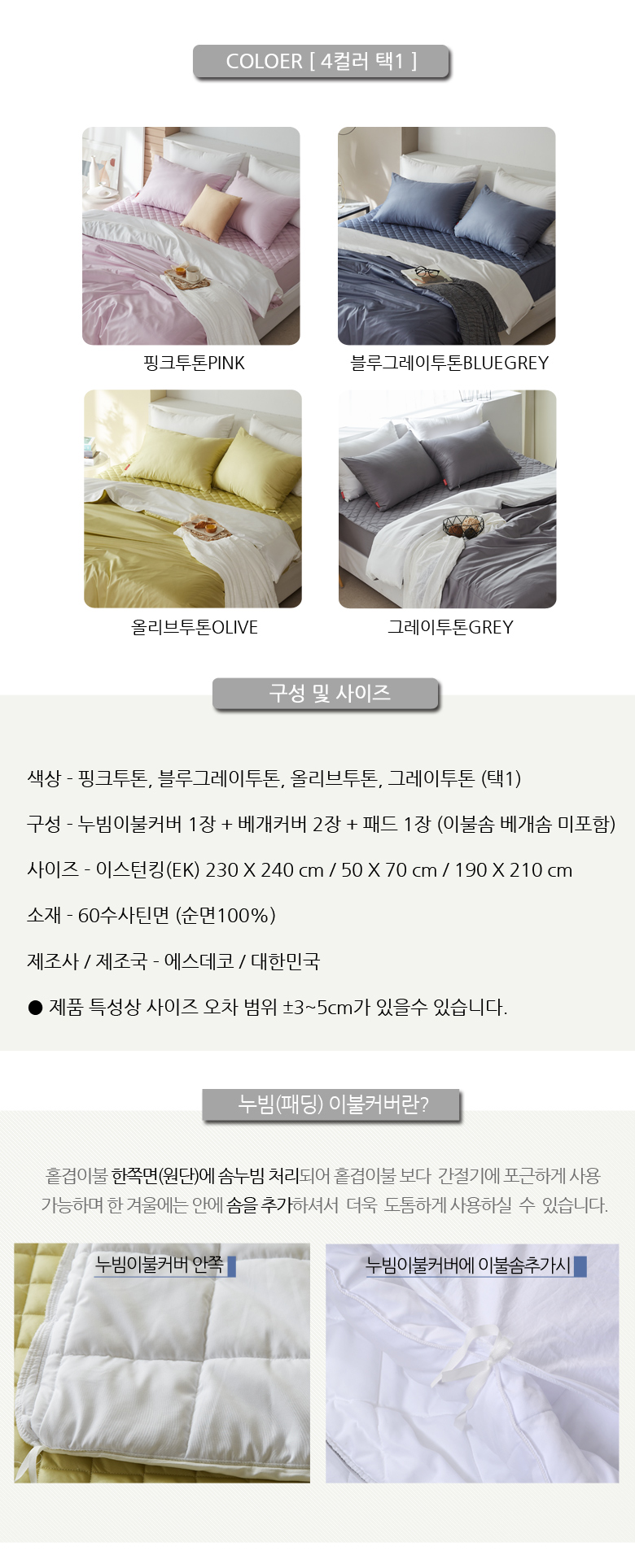 60수사틴 순면 투톤누빔이불커버패드세트EK 4컬러