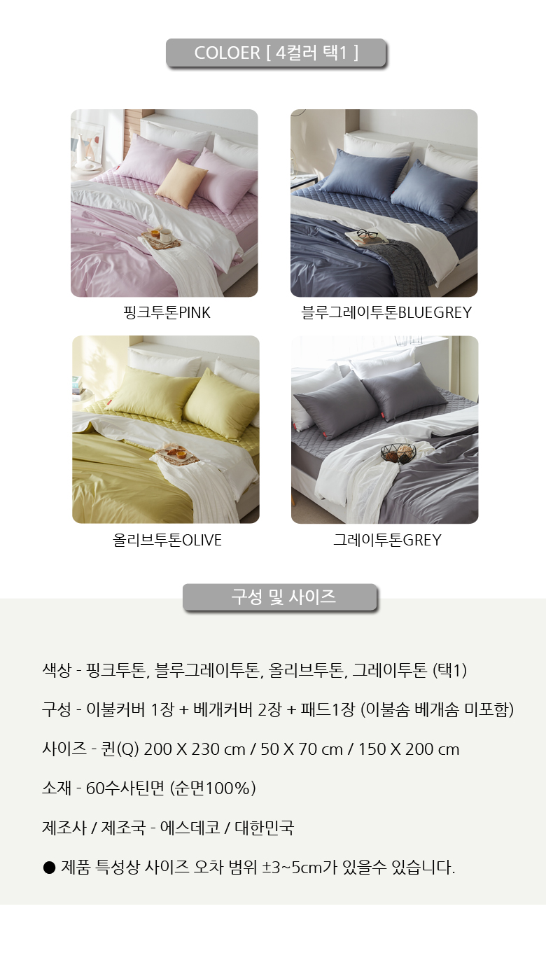 60수사틴 핑크투톤 순면이불커버패드세트 호텔침구Q퀸