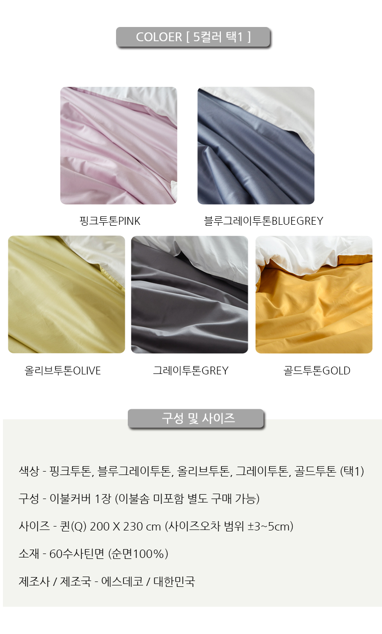 60수사틴 순면 블루투톤이불커버 호텔침구Q퀸