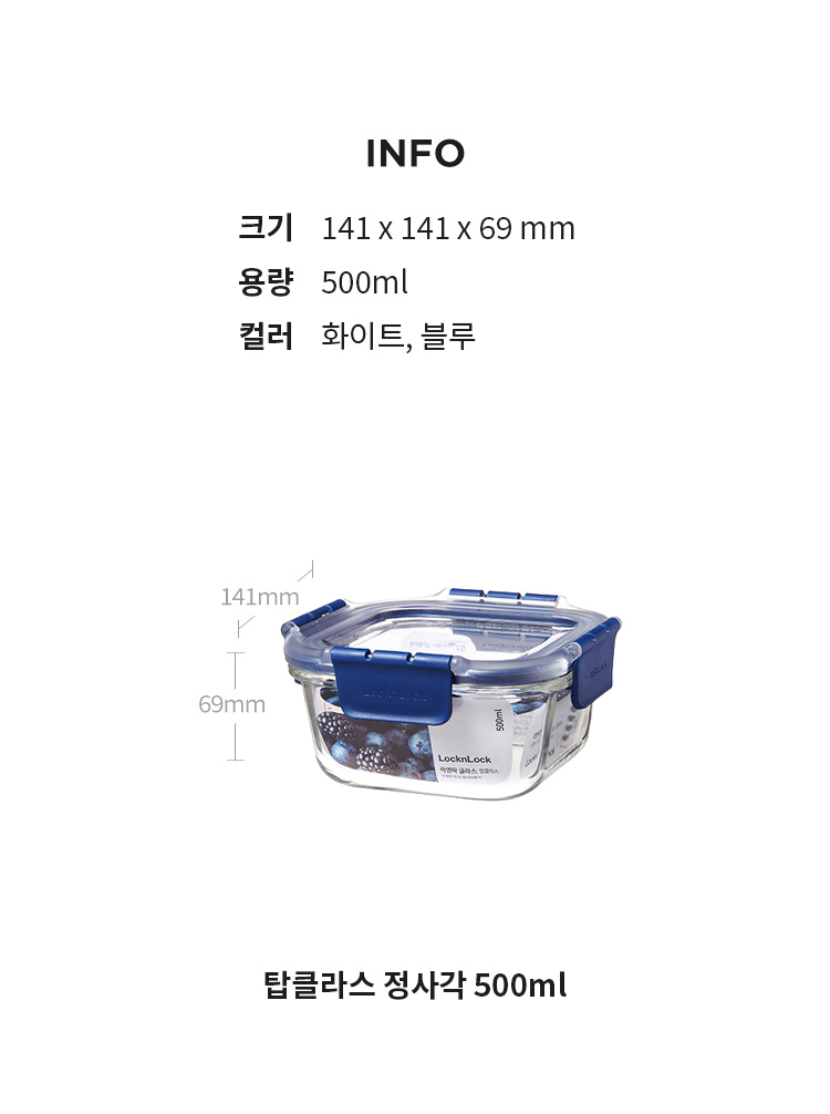 락앤락 탑클라스 500ml 내열 유리 밀폐 용기 정사각 3P세트 전자레인지 반찬통 냉동 보관 밥 TOP_LBG214s3