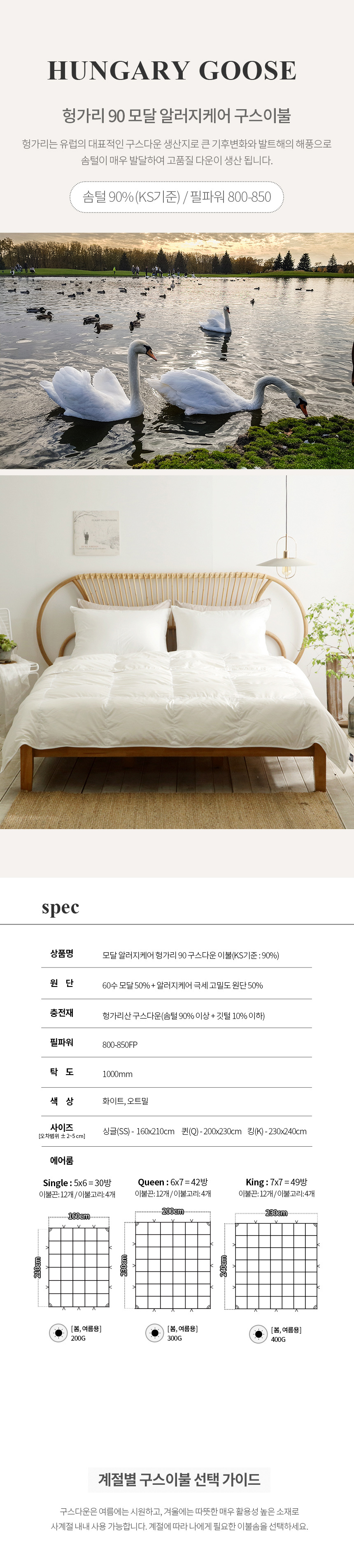라셀렌 헝가리 다운90% 모달 알러지케어 구스이불 SS/Q/K (봄여름용)