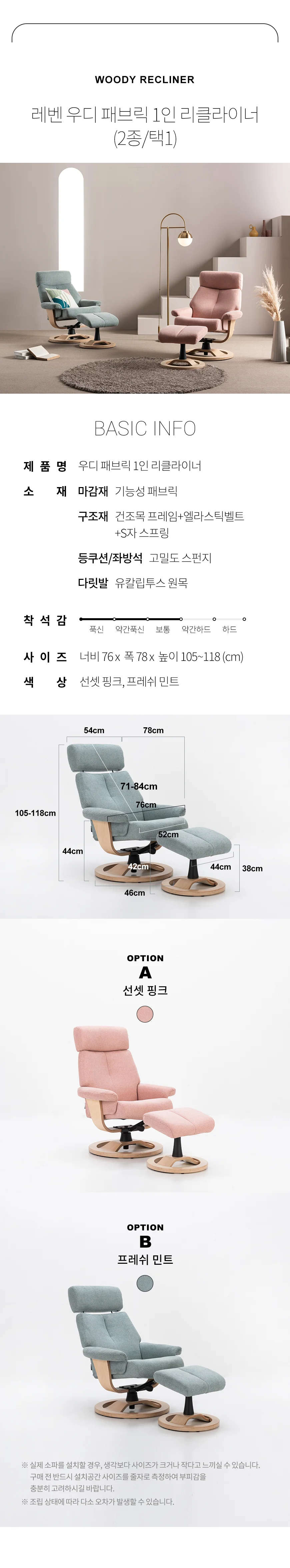 (한샘몰pick) 레벤 우디 기능성 패브릭 리클라이너 소파 1인 (2종/택1)