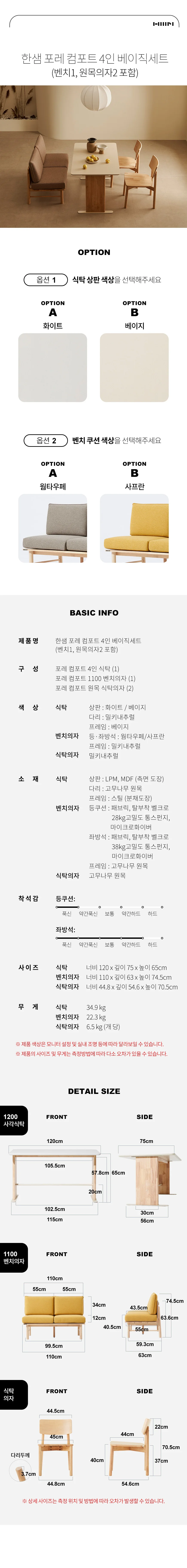 (new시즌컬러) 포레 컴포트 4인 베이직세트 (벤치1, 원목의자2 포함)