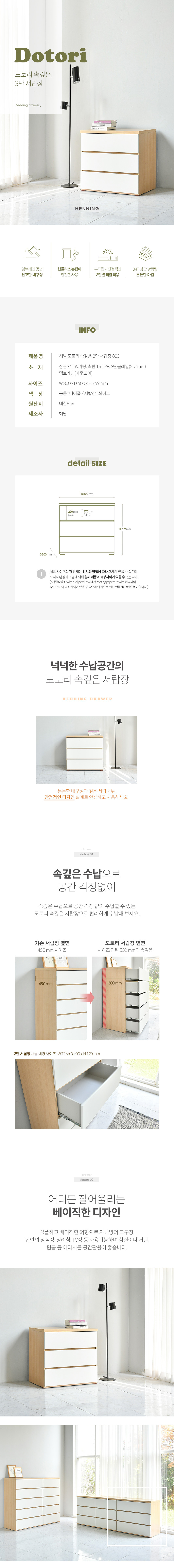 도토리 속깊은 3단 서랍장 800