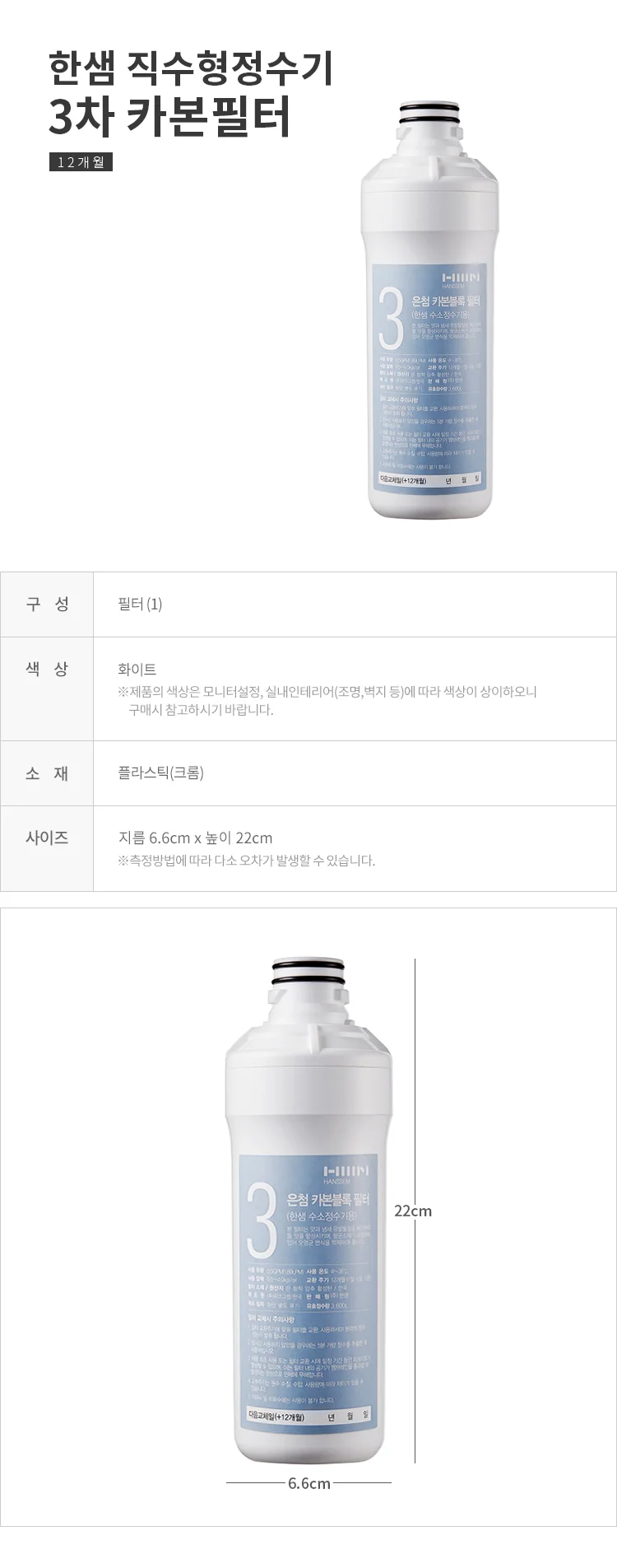 주방 직수형정수기 3차 카본필터 (12개월)