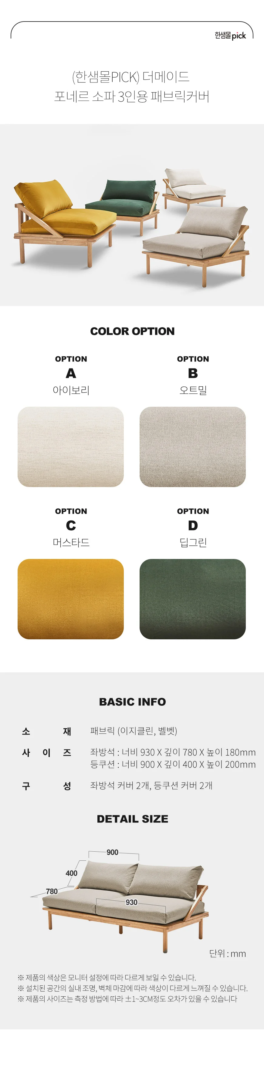 (한샘몰pick) 더메이드 포네르 원목 패브릭소파 3인용 패브릭커버 (4colors)