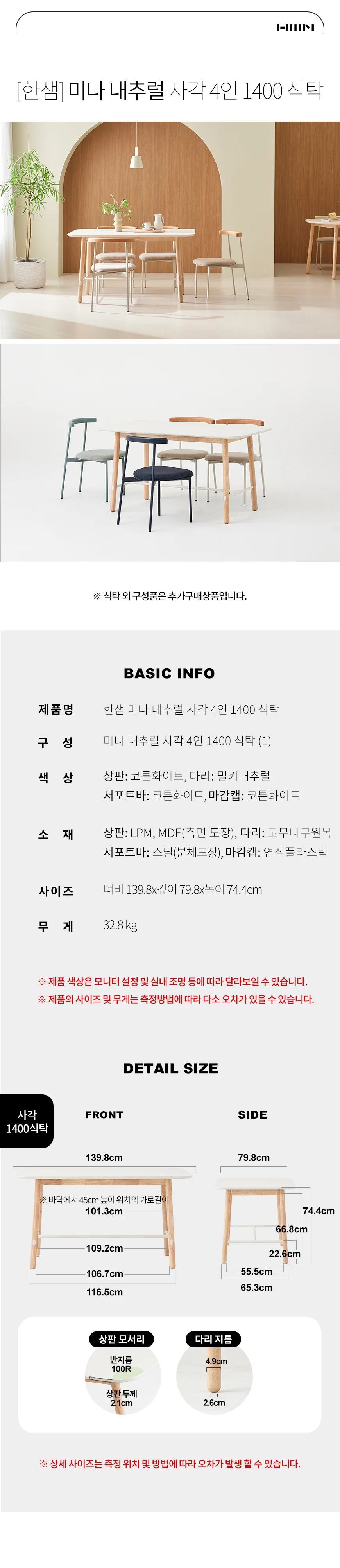 미나 내추럴 사각 4인 1400 식탁