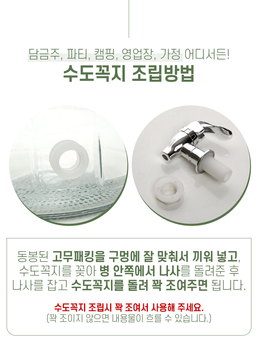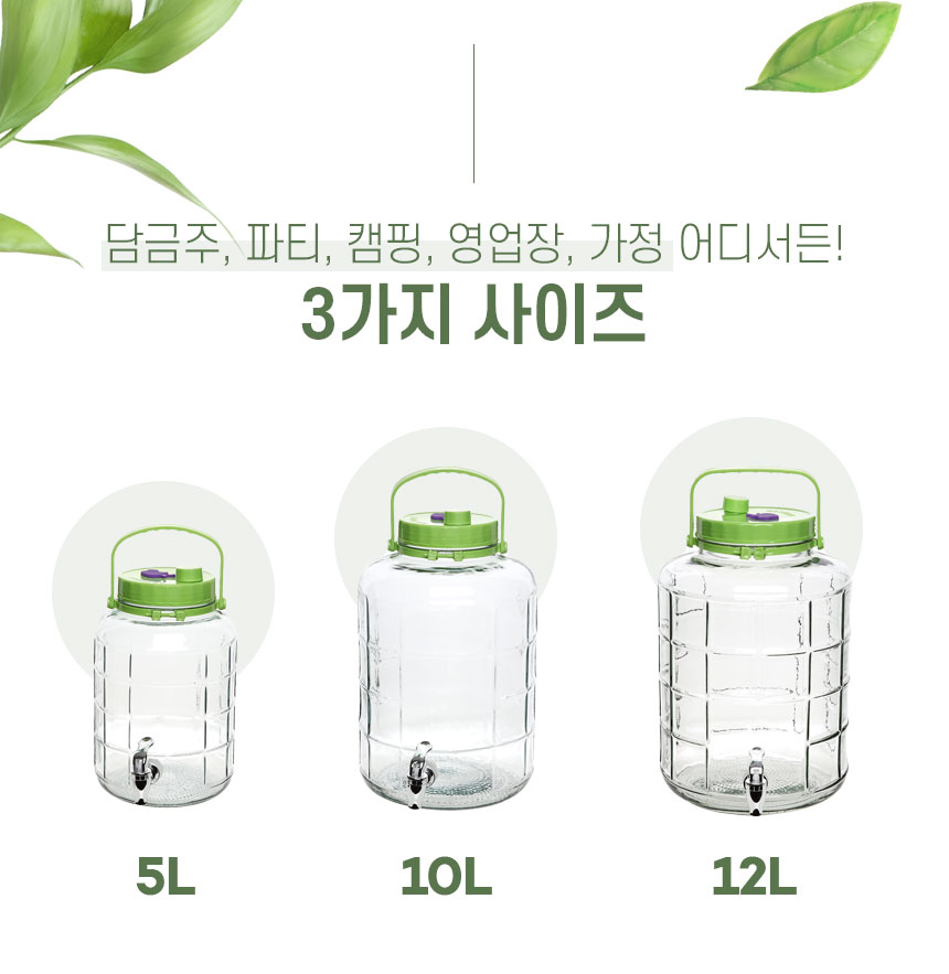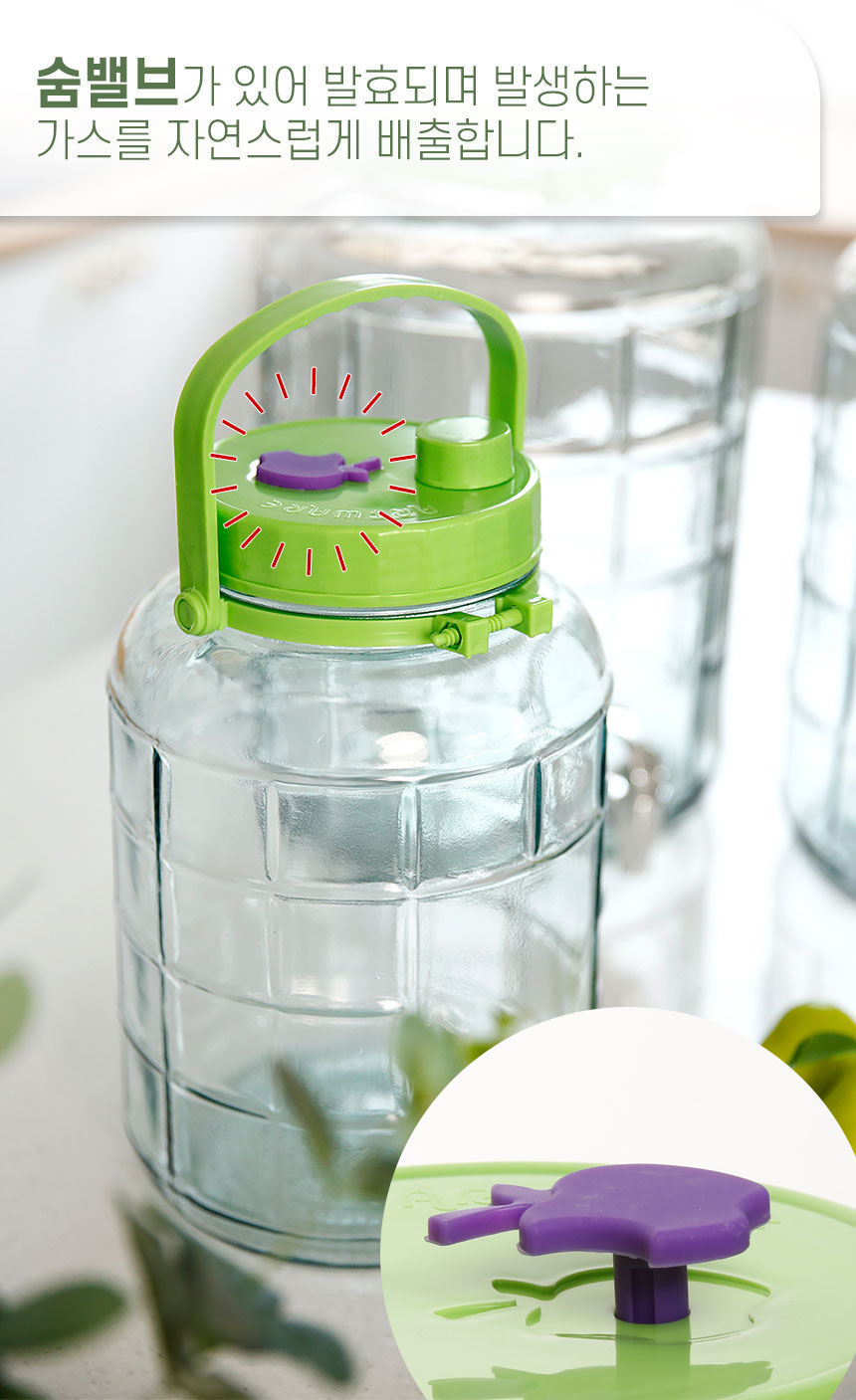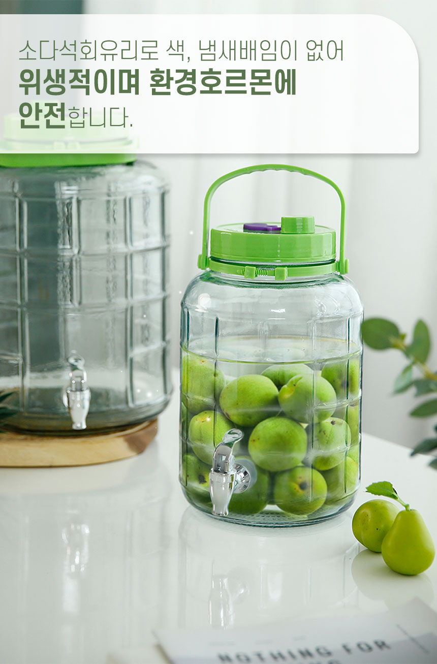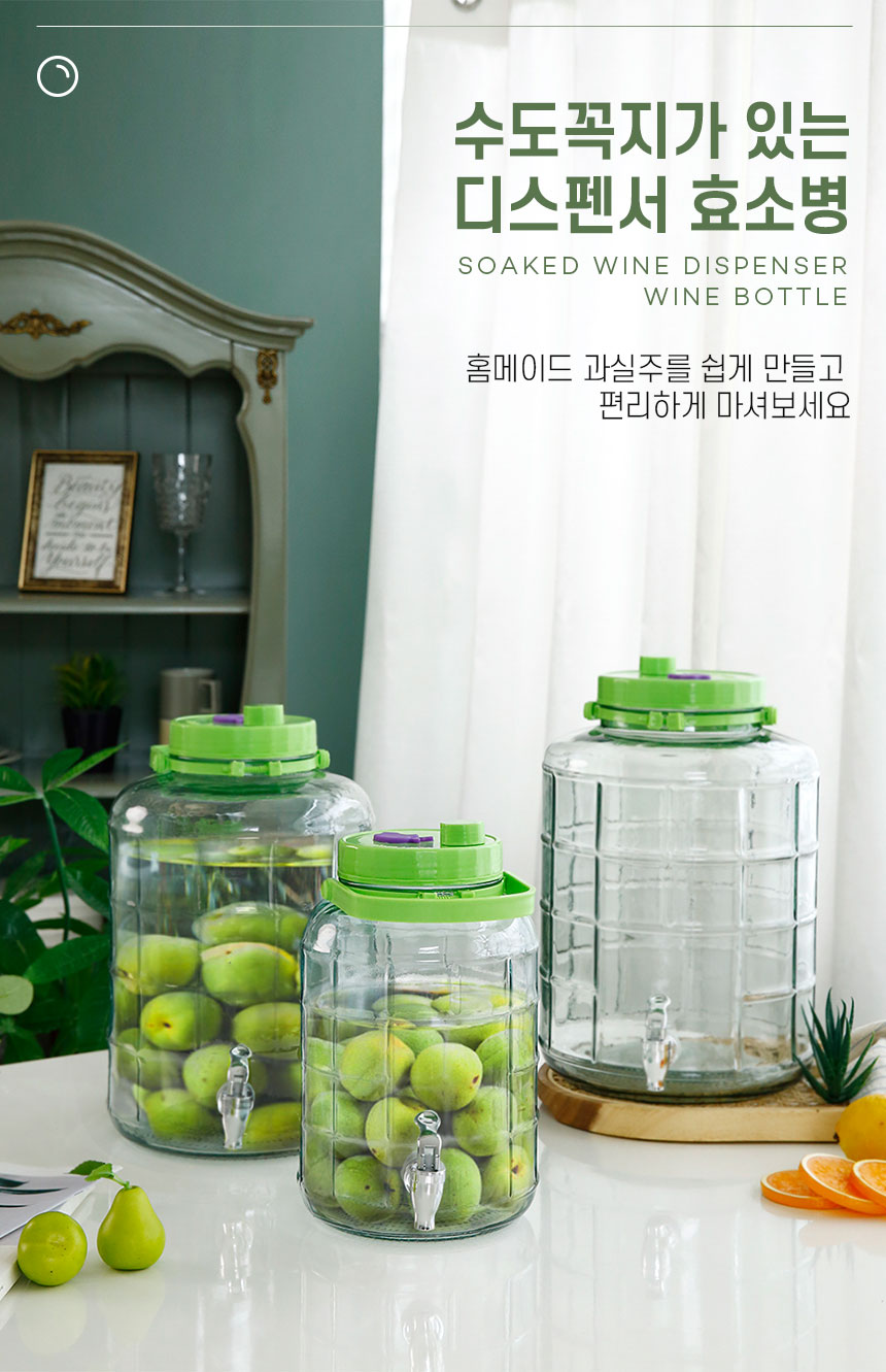 수도꼭지 포함유리 과실주병 입니다환경호르몬 걱정없는 소다석회유리로제작하여 위생적이며숨밸브가 있어 발효 가스를자연스럽게 배출가능한 숨쉬는 효소병!과일청, 매실청, 장아찌, 담금주병으로안성맞춤 밀폐유리병 입니다.자세한 내용은 아래 상세페이지를확인하세요