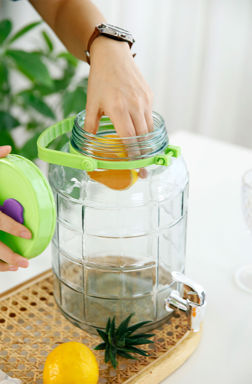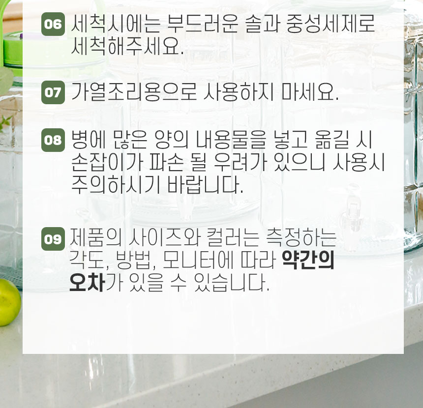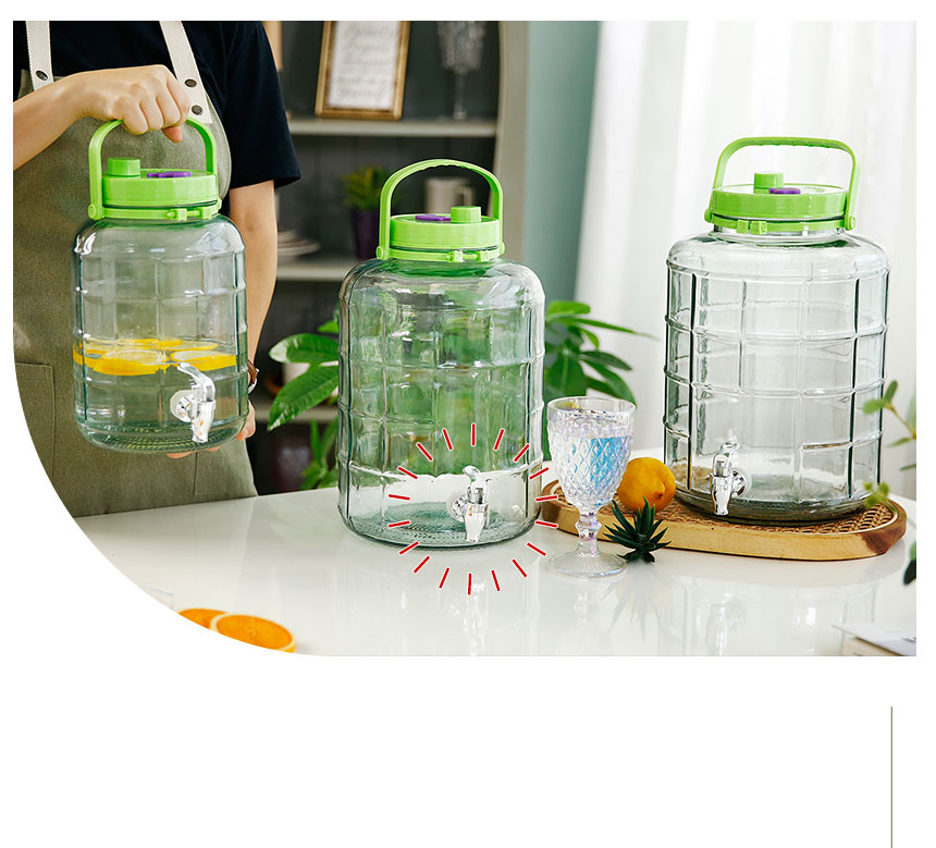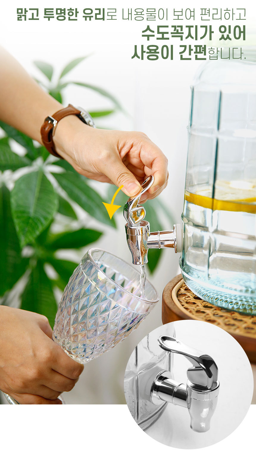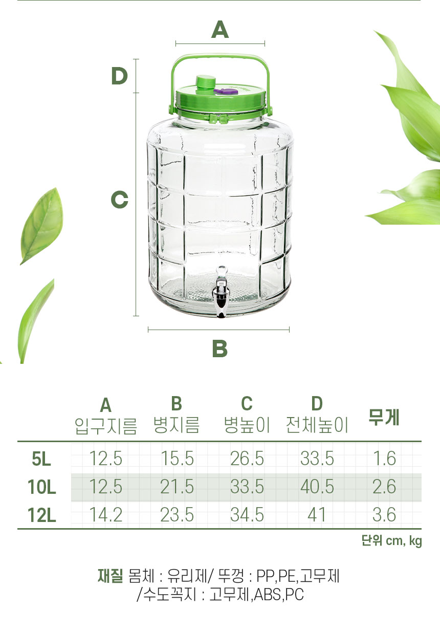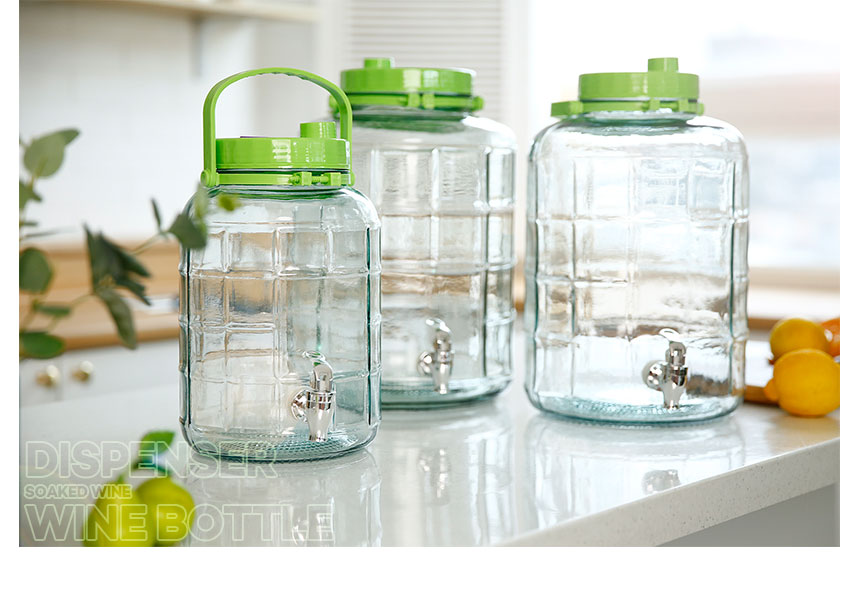 수도꼭지 포함유리 과실주병 입니다환경호르몬 걱정없는 소다석회유리로제작하여 위생적이며숨밸브가 있어 발효 가스를자연스럽게 배출가능한 숨쉬는 효소병!과일청, 매실청, 장아찌, 담금주병으로안성맞춤 밀폐유리병 입니다.자세한 내용은 아래 상세페이지를확인하세요