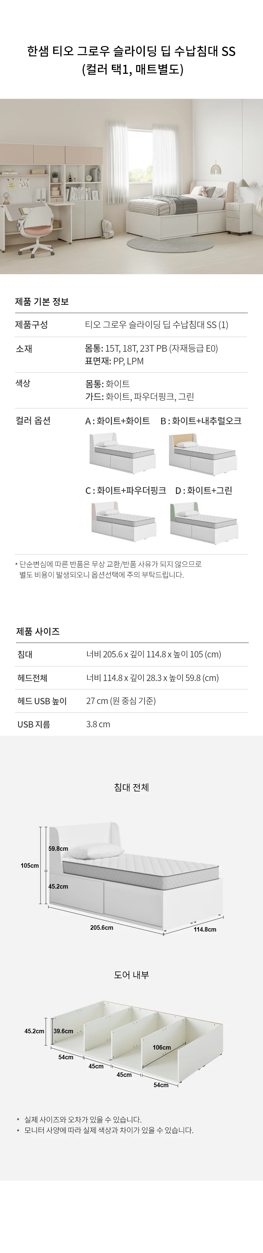 티오 그로우 슬라이딩 딥 수납침대 SS (매트별도, 컬러 택1)
