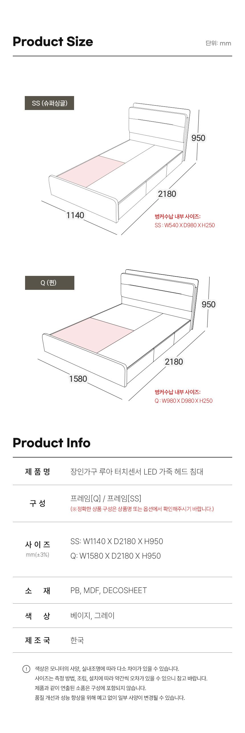 루아 LED수납 가죽침대 SS/Q