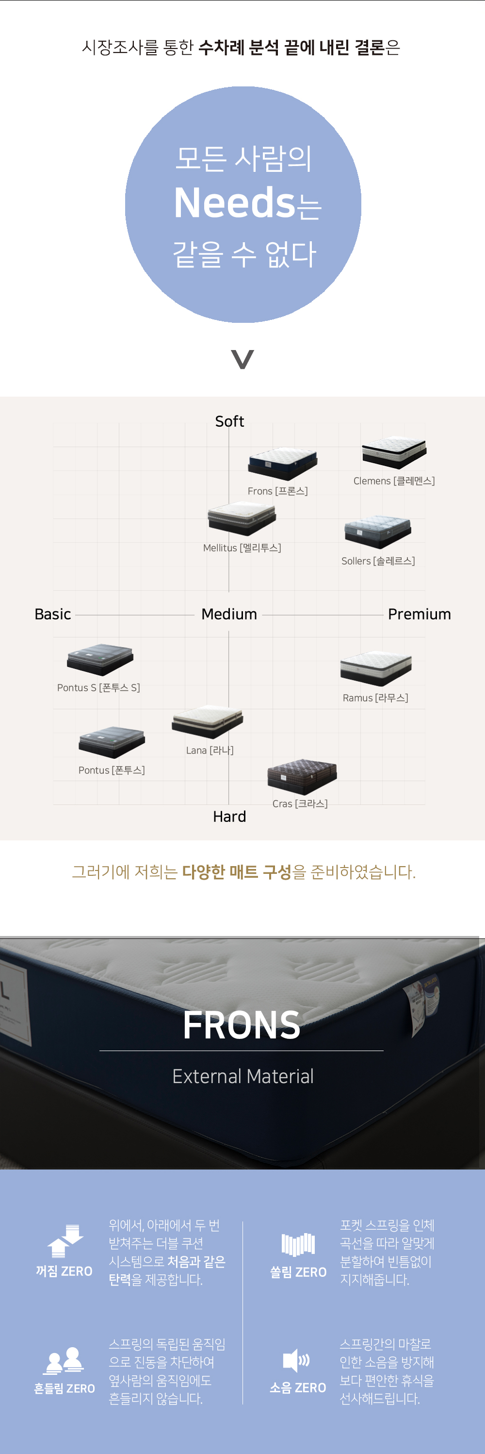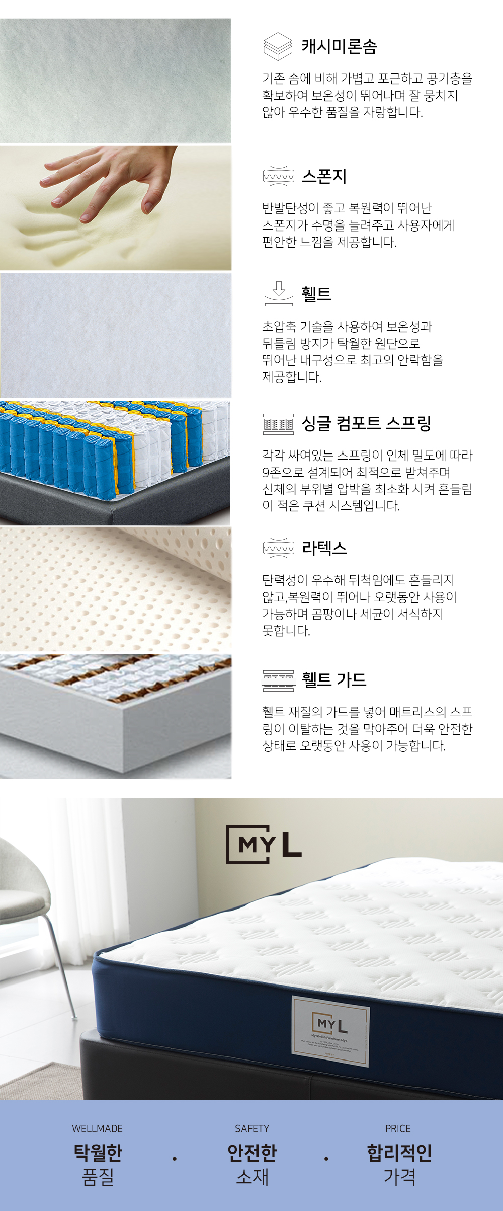 #삼중직 원단, 캐시미론솜, 스폰지, 부직포, 라텍스, 고탄성폼, 자가드원단, 스폰지, 백색휄트, 싱글 컴포트 스프링의 소재를 활용하여 탁월한 품질과 안전한 소재로 합리적인 매트리스를 만들었습니다.