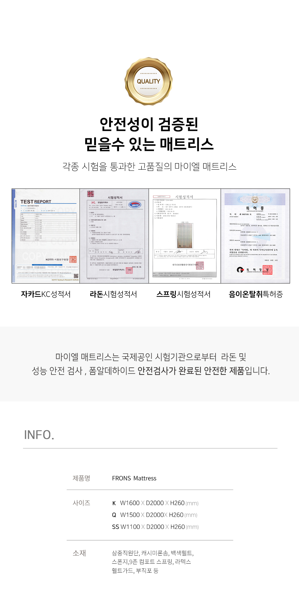 #마이엘 매트리스는 국제공인 시험기관으로부터 라돈 및 성능 안전 검사, 폼알데하이드 안전검사가 완료된 안전한 제품입니다.